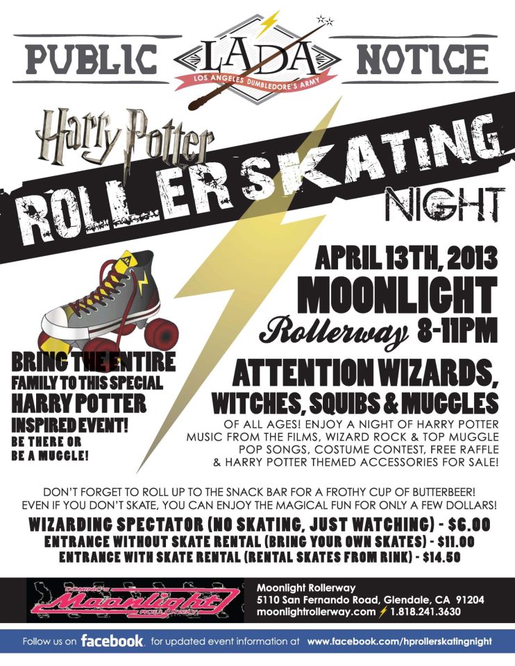 But a HUGE event for us is the Harry Potter Roller Skating Night. We held out first one last April, in 2012, and over 650 people showed up! It was fantastic! So, of course, we had to do it again this year, and yesterday, we partied hard at the Moonlight Rollerway in Glendale.